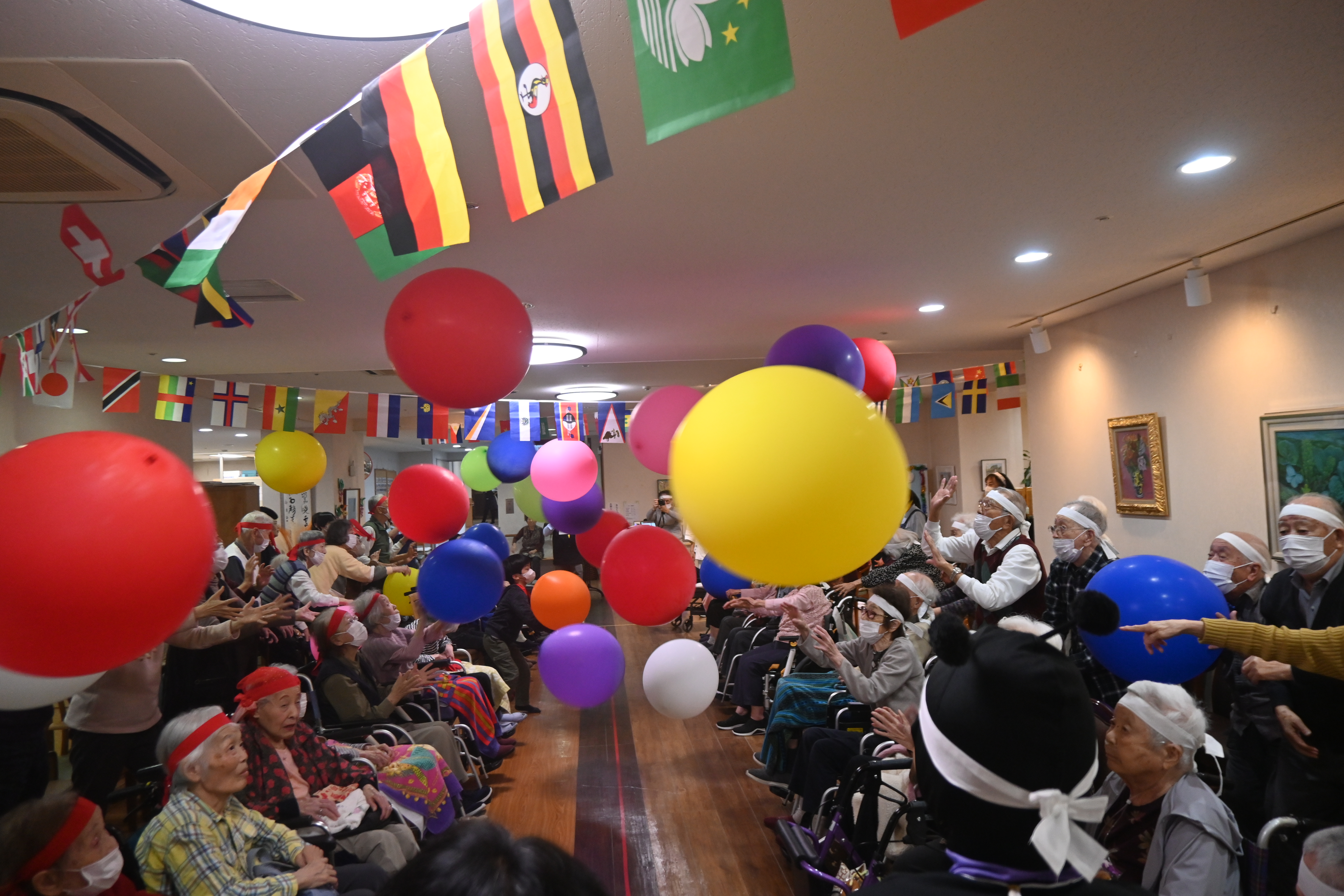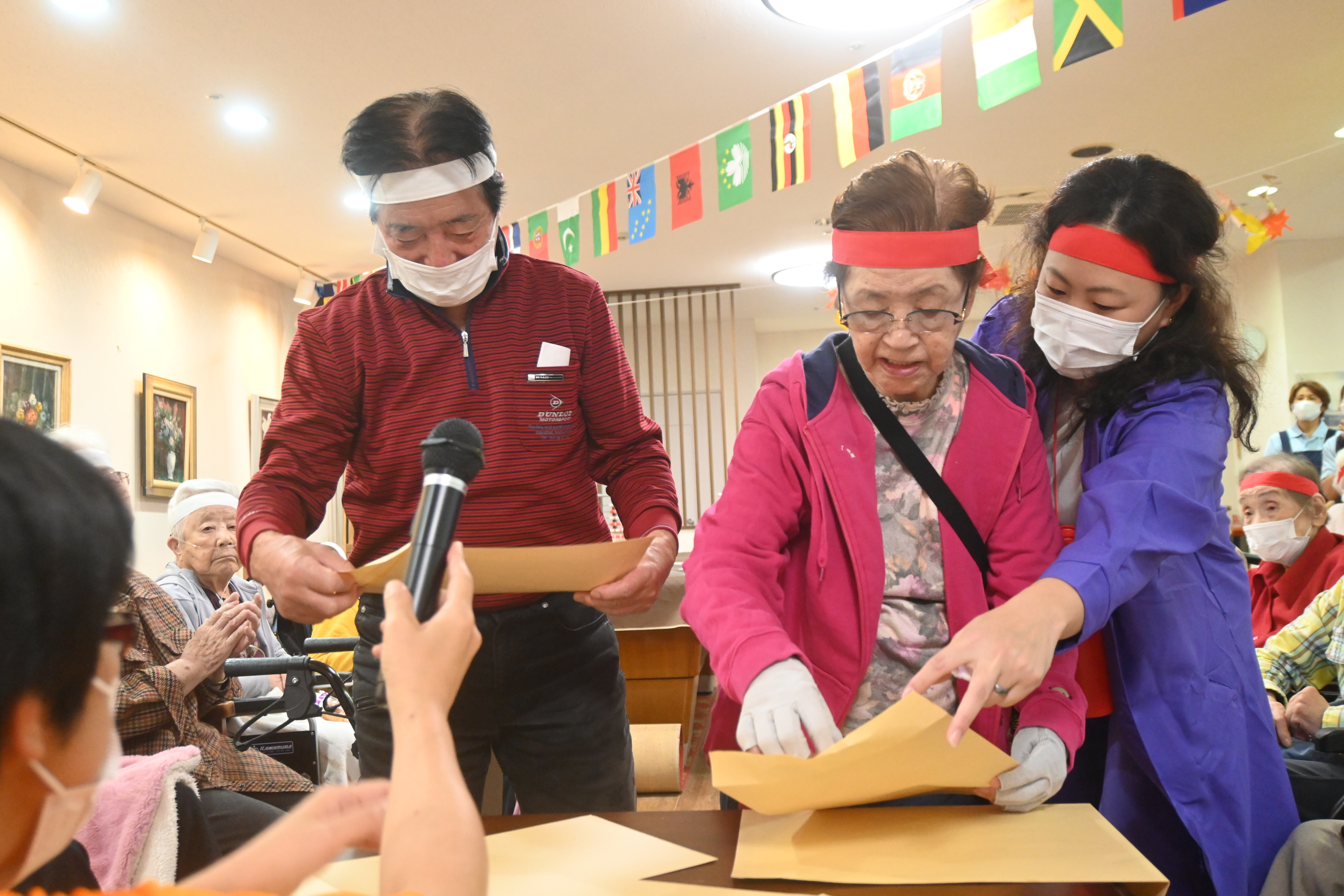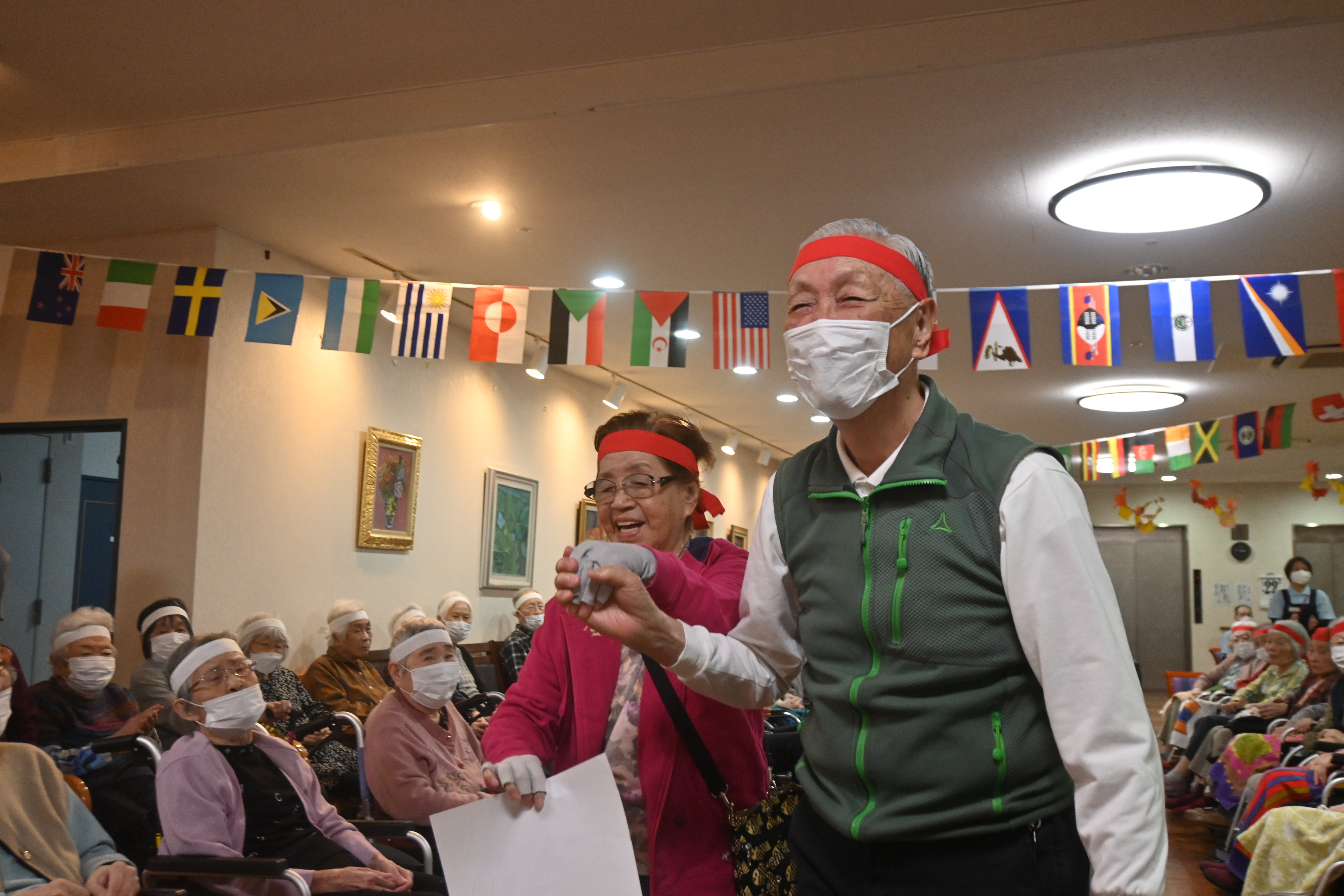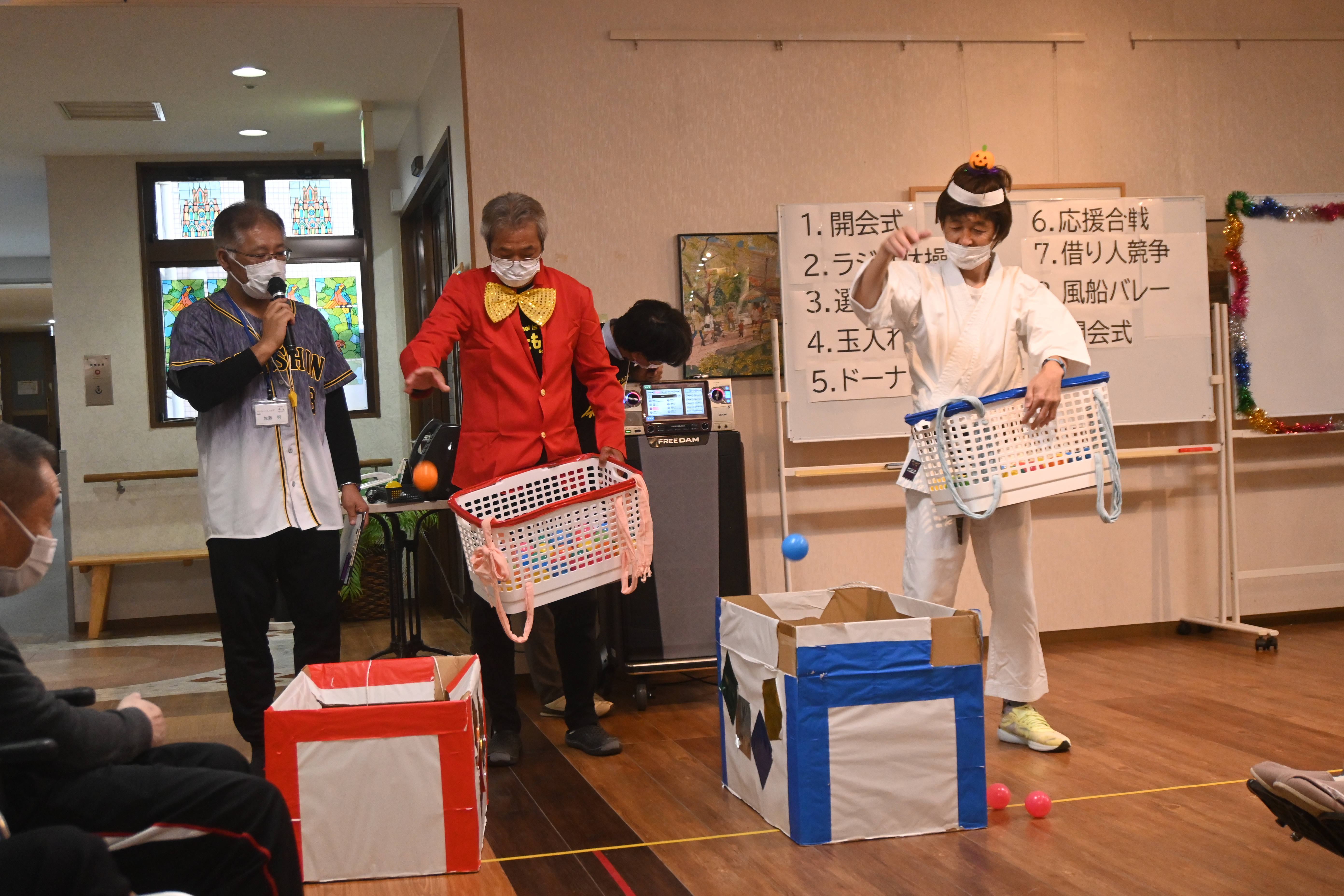 2025 年 10 月 29 日公開 八王子施設「秋の大運動会」 #ウェルハイム・八王子 #令和7年(2025年) 秋の大運動会を開催しました 開会宣言&プログラム 秋の大運動会の開会宣言と当日のプログラムです。 赤組と白組に分かれて…みんなで力を合わせて「がんばるぞー!」 赤組代表、白組代表による選手宣誓です。 第1種目は「玉入れ」です。職員が背負ったカゴや洗面器に玉を投げ入れます。 かごに入った玉の数をみんなで声を合わせて数えます。 第2種目は「ドーナツ掴み競争」です。全員が座ったままドーナツを掴み取り、先にチーム全員が取り終わった方が勝利です。 運営スタッフが揺らすので、思うようには掴み取れません… 競技の中間で、勝つのは「赤だー!」、「白だー」と赤組、白組に分かれてみんなで声を合わせて応援合戦を行いました。 第3種目は「借り物」ではなく、「借り人競争」です。ご自身が引いたお題に沿った人物を探してゴールを目指します! ゴールではお題に合っている人か施設長によるジャッジがありました。 最終種目は「風船バレー」です。1分間の間に相手陣地に風船を投げ返して風船が少ないチームの勝利となります。 ご参加いただいた赤組のご入居者様と運営スタッフ⓵ ご参加いただいた赤組ご入居者様と運営スタッフ⓶ ご参加いただいた白組ご入居者様と運営スタッフ⓵ ご参加いただいた白組ご入居者様と運営スタッフ⓶ 全ての競技を座ったままで実施できるように工夫を凝らして開催し、ご入居者様の笑顔をたくさん見ることが出来ました。