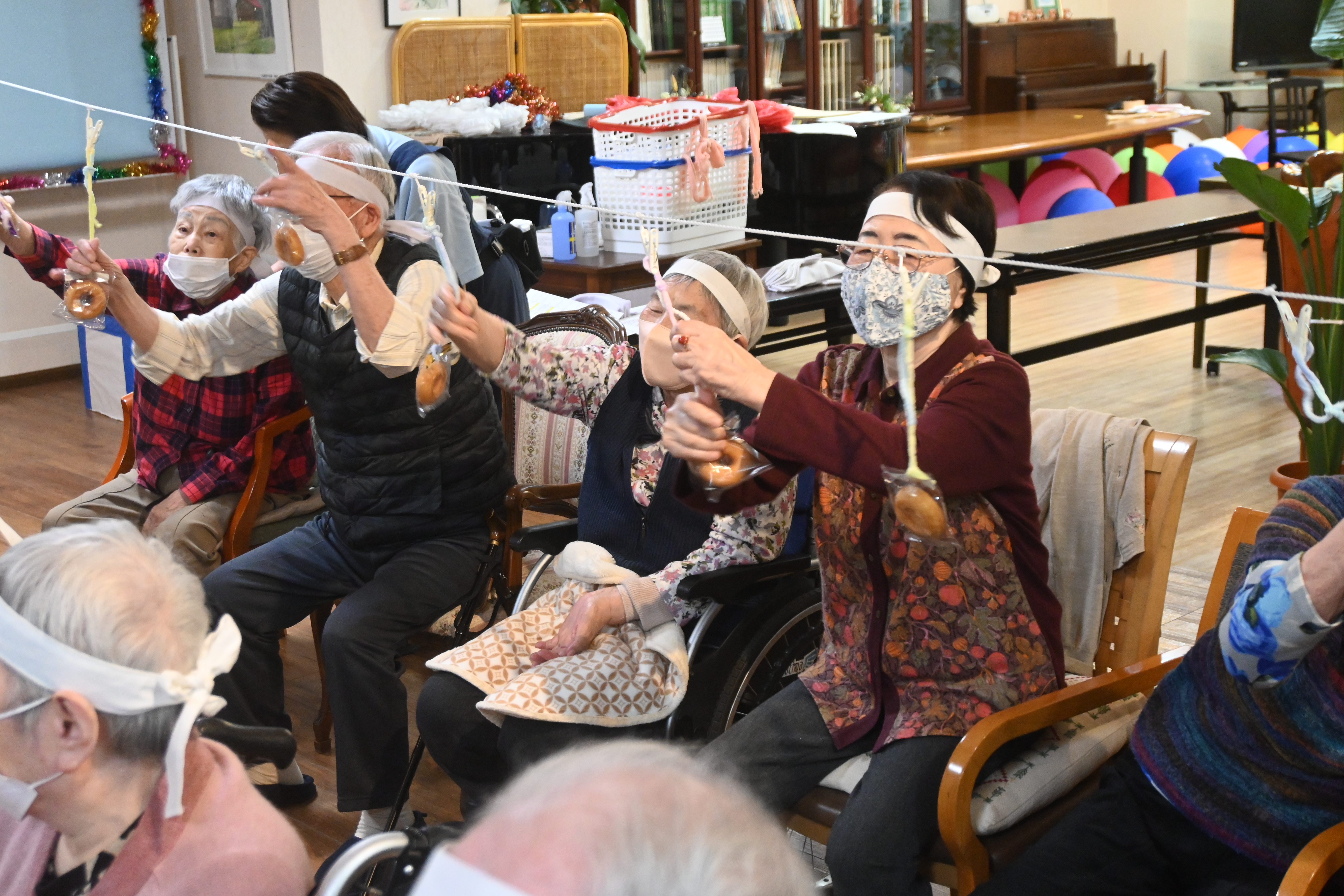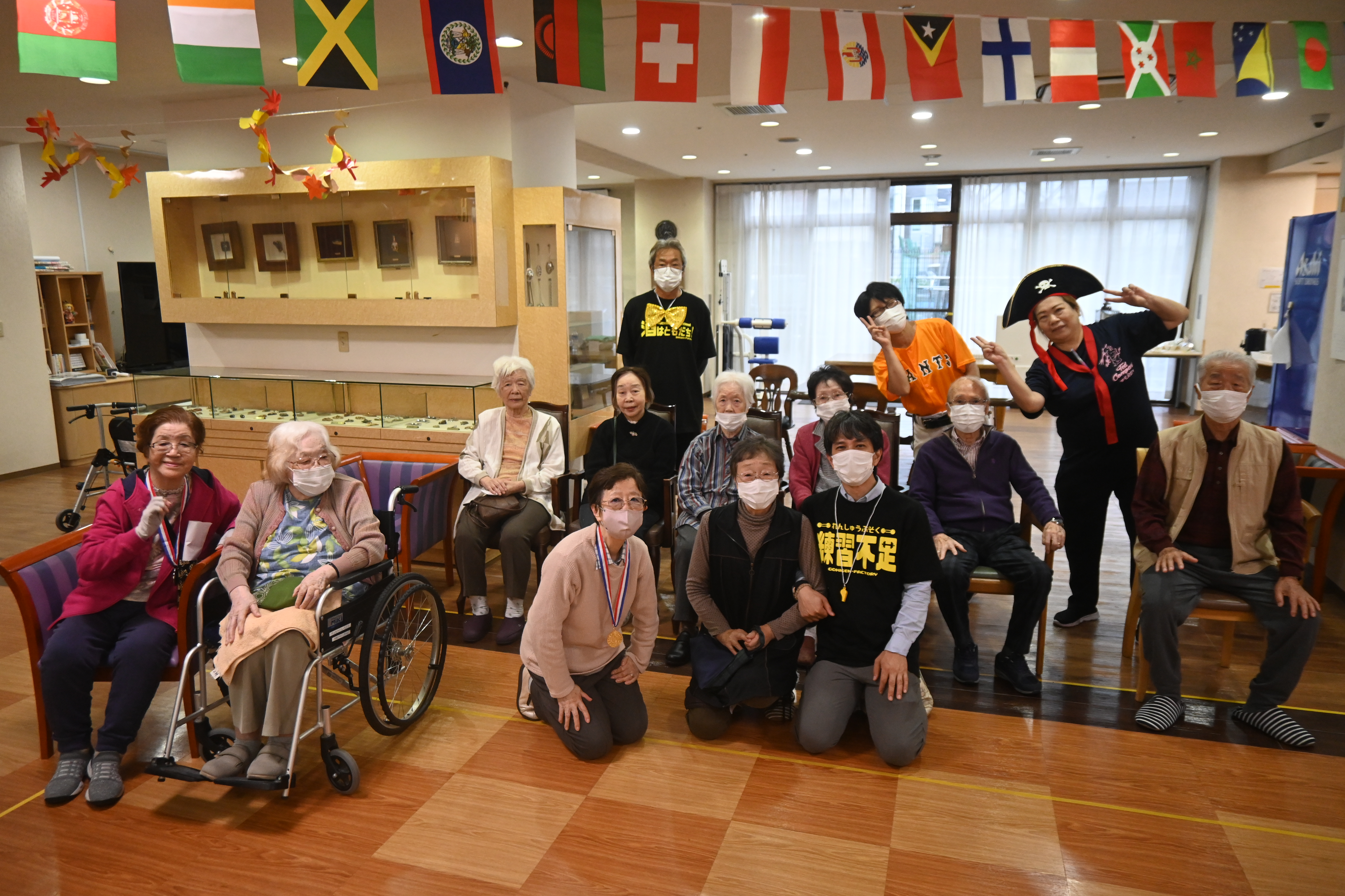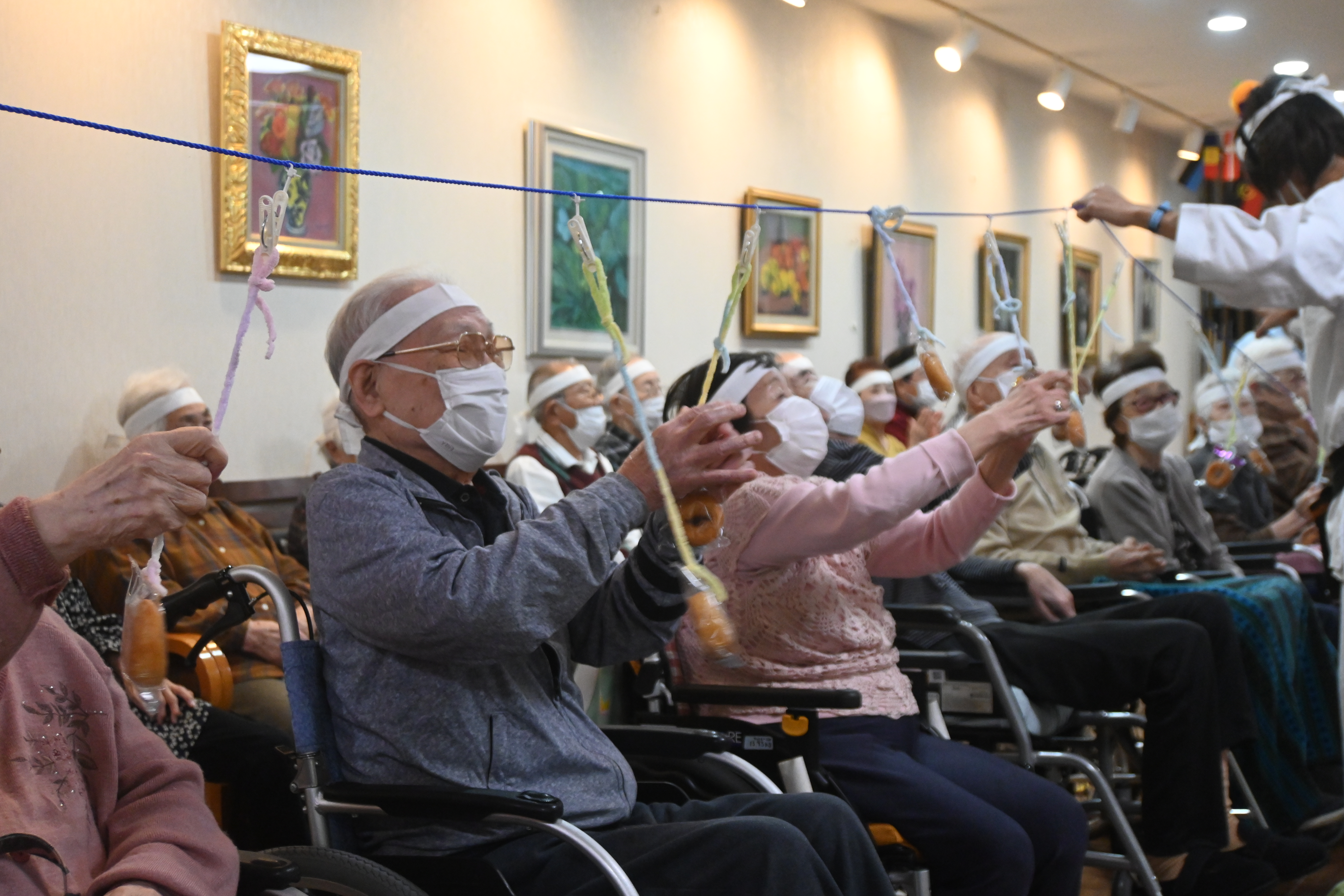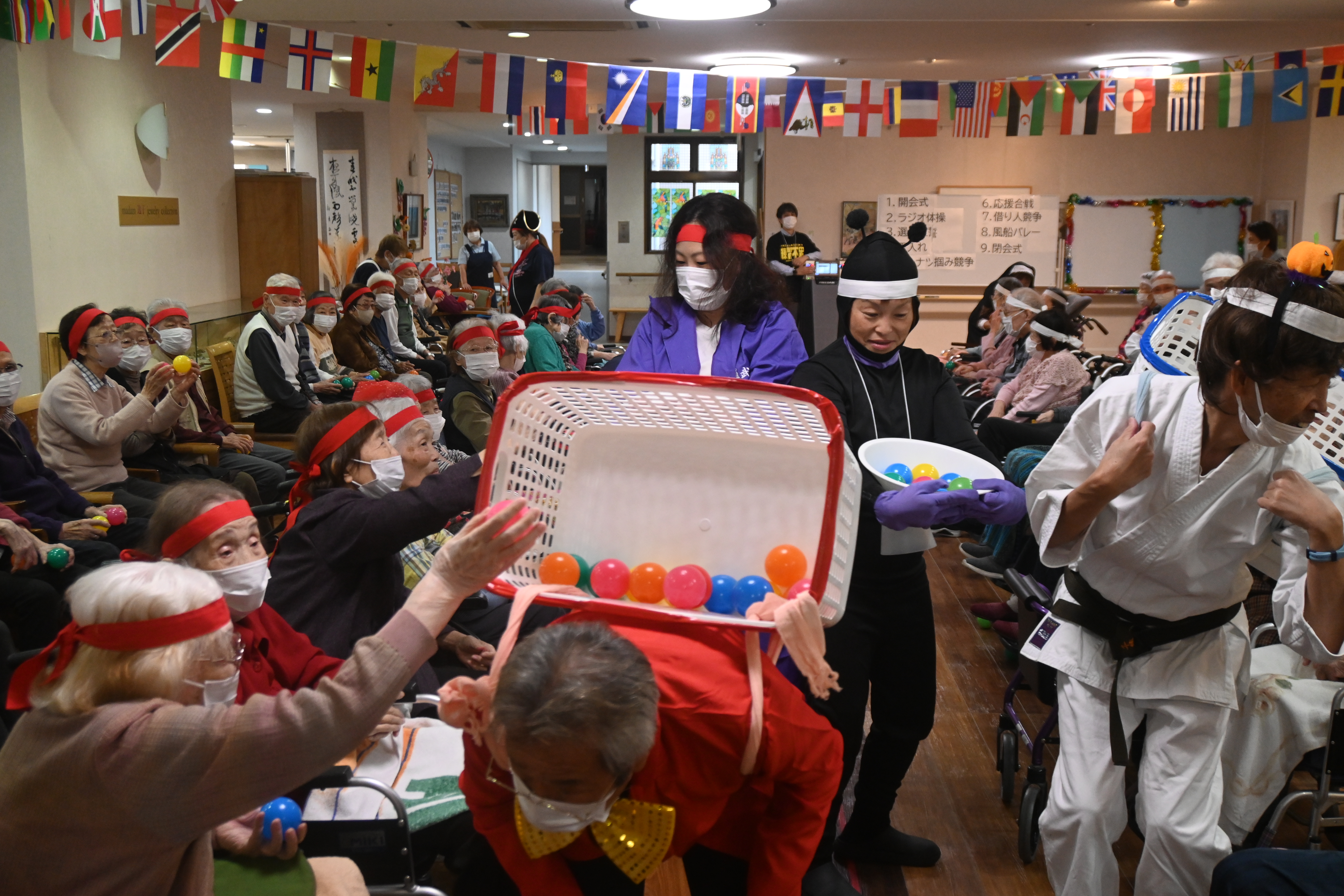 2025 年 10 月 29 日公開 八王子施設「秋の大運動会」 #ウェルハイム・八王子 #令和7年(2025年) 秋の大運動会を開催しました 開会宣言&プログラム 秋の大運動会の開会宣言と当日のプログラムです。 赤組と白組に分かれて…みんなで力を合わせて「がんばるぞー!」 赤組代表、白組代表による選手宣誓です。 第1種目は「玉入れ」です。職員が背負ったカゴや洗面器に玉を投げ入れます。 かごに入った玉の数をみんなで声を合わせて数えます。 第2種目は「ドーナツ掴み競争」です。全員が座ったままドーナツを掴み取り、先にチーム全員が取り終わった方が勝利です。 運営スタッフが揺らすので、思うようには掴み取れません… 競技の中間で、勝つのは「赤だー!」、「白だー」と赤組、白組に分かれてみんなで声を合わせて応援合戦を行いました。 第3種目は「借り物」ではなく、「借り人競争」です。ご自身が引いたお題に沿った人物を探してゴールを目指します! ゴールではお題に合っている人か施設長によるジャッジがありました。 最終種目は「風船バレー」です。1分間の間に相手陣地に風船を投げ返して風船が少ないチームの勝利となります。 ご参加いただいた赤組のご入居者様と運営スタッフ⓵ ご参加いただいた赤組ご入居者様と運営スタッフ⓶ ご参加いただいた白組ご入居者様と運営スタッフ⓵ ご参加いただいた白組ご入居者様と運営スタッフ⓶ 全ての競技を座ったままで実施できるように工夫を凝らして開催し、ご入居者様の笑顔をたくさん見ることが出来ました。