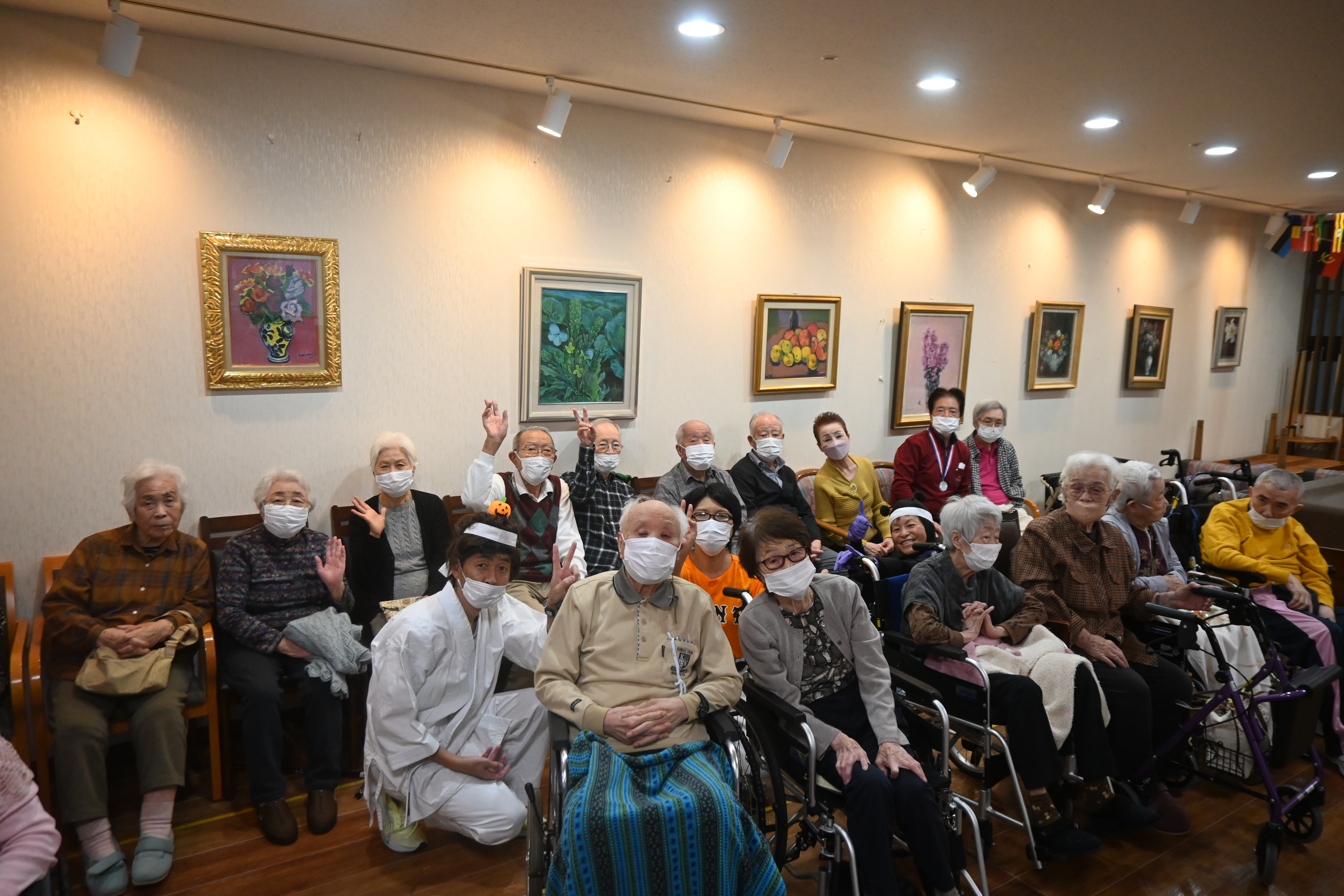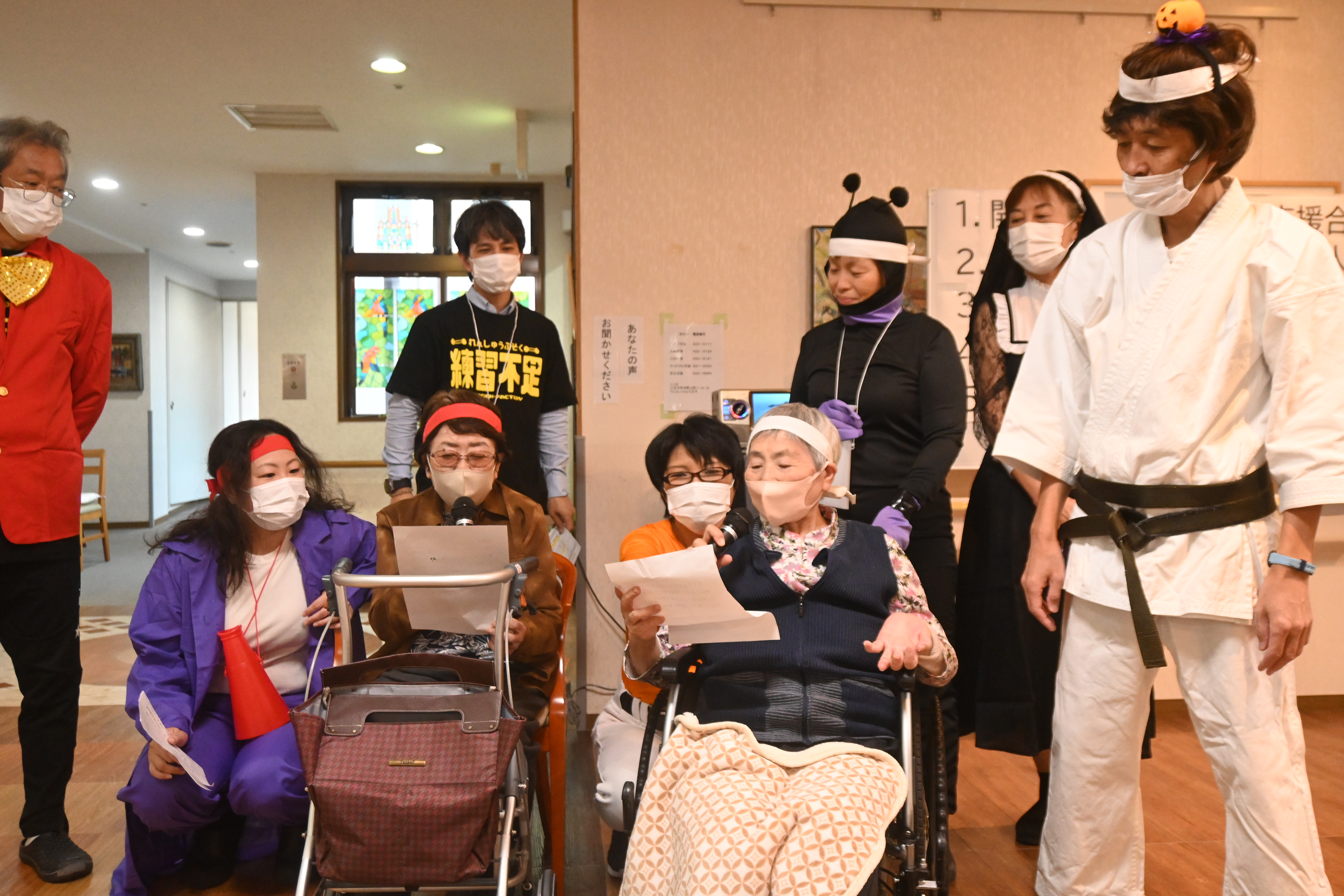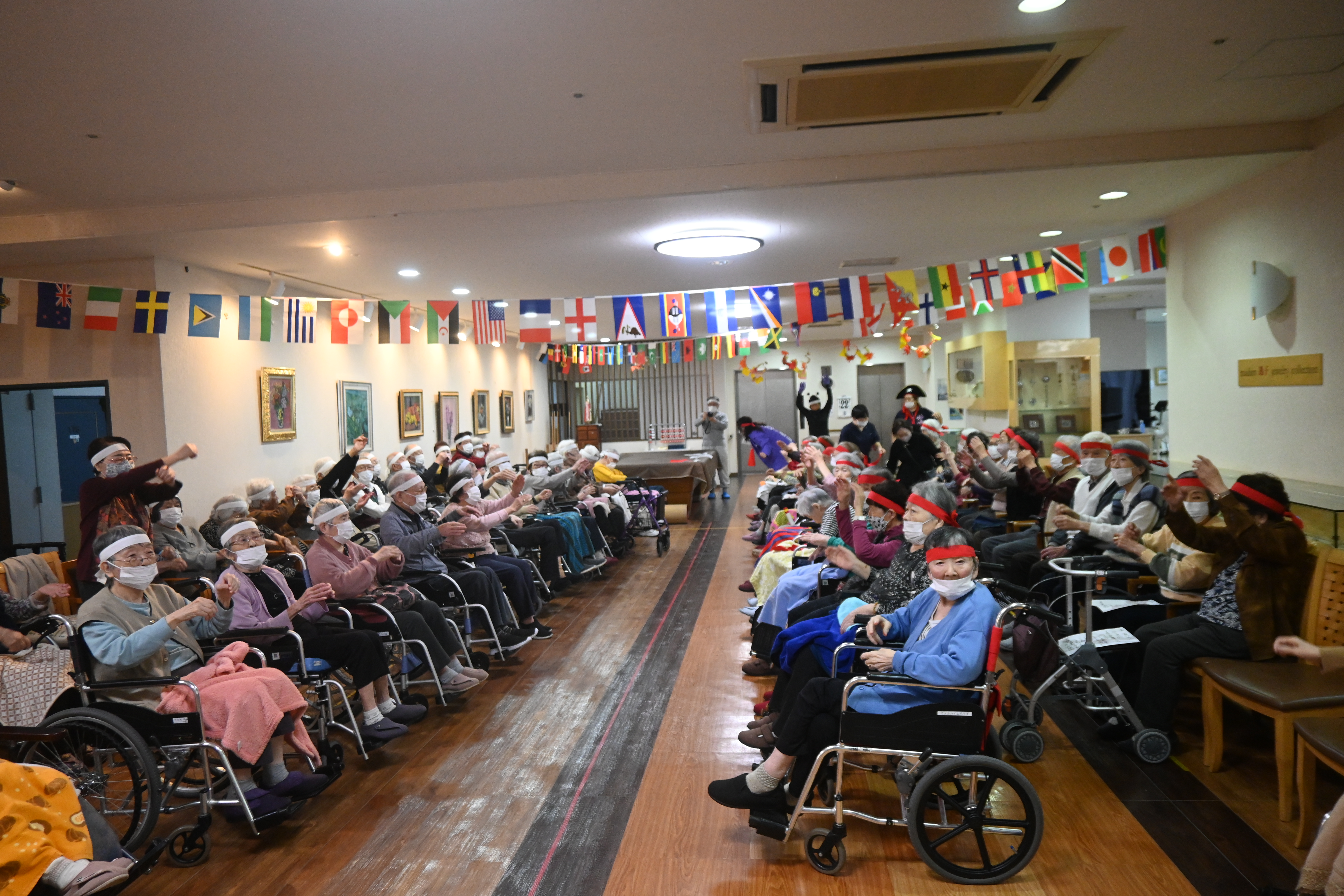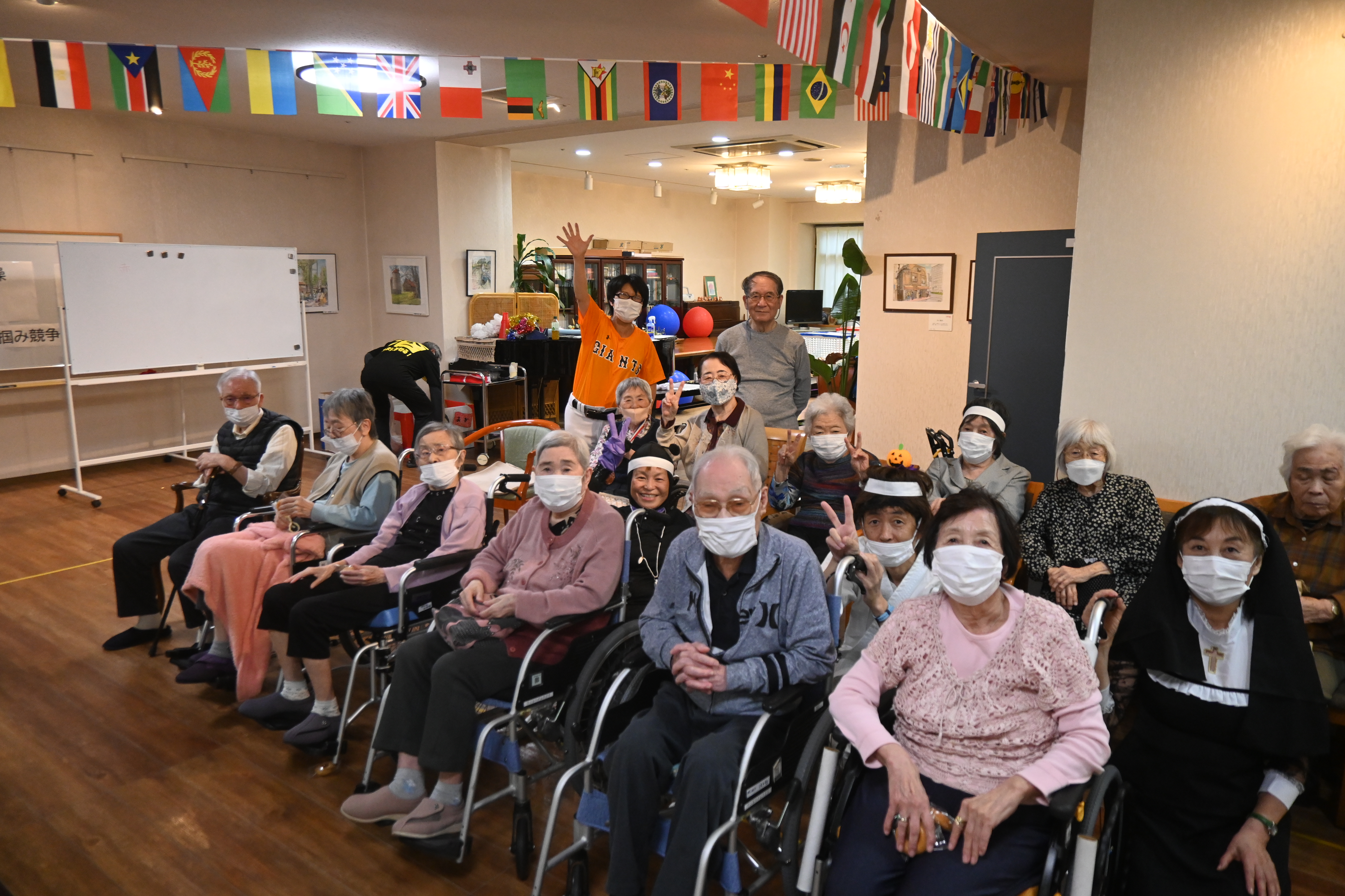 2025 年 10 月 29 日公開 八王子施設「秋の大運動会」 #ウェルハイム・八王子 #令和7年(2025年) 秋の大運動会を開催しました 開会宣言&プログラム 秋の大運動会の開会宣言と当日のプログラムです。 赤組と白組に分かれて…みんなで力を合わせて「がんばるぞー!」 赤組代表、白組代表による選手宣誓です。 第1種目は「玉入れ」です。職員が背負ったカゴや洗面器に玉を投げ入れます。 かごに入った玉の数をみんなで声を合わせて数えます。 第2種目は「ドーナツ掴み競争」です。全員が座ったままドーナツを掴み取り、先にチーム全員が取り終わった方が勝利です。 運営スタッフが揺らすので、思うようには掴み取れません… 競技の中間で、勝つのは「赤だー!」、「白だー」と赤組、白組に分かれてみんなで声を合わせて応援合戦を行いました。 第3種目は「借り物」ではなく、「借り人競争」です。ご自身が引いたお題に沿った人物を探してゴールを目指します! ゴールではお題に合っている人か施設長によるジャッジがありました。 最終種目は「風船バレー」です。1分間の間に相手陣地に風船を投げ返して風船が少ないチームの勝利となります。 ご参加いただいた赤組のご入居者様と運営スタッフ⓵ ご参加いただいた赤組ご入居者様と運営スタッフ⓶ ご参加いただいた白組ご入居者様と運営スタッフ⓵ ご参加いただいた白組ご入居者様と運営スタッフ⓶ 全ての競技を座ったままで実施できるように工夫を凝らして開催し、ご入居者様の笑顔をたくさん見ることが出来ました。